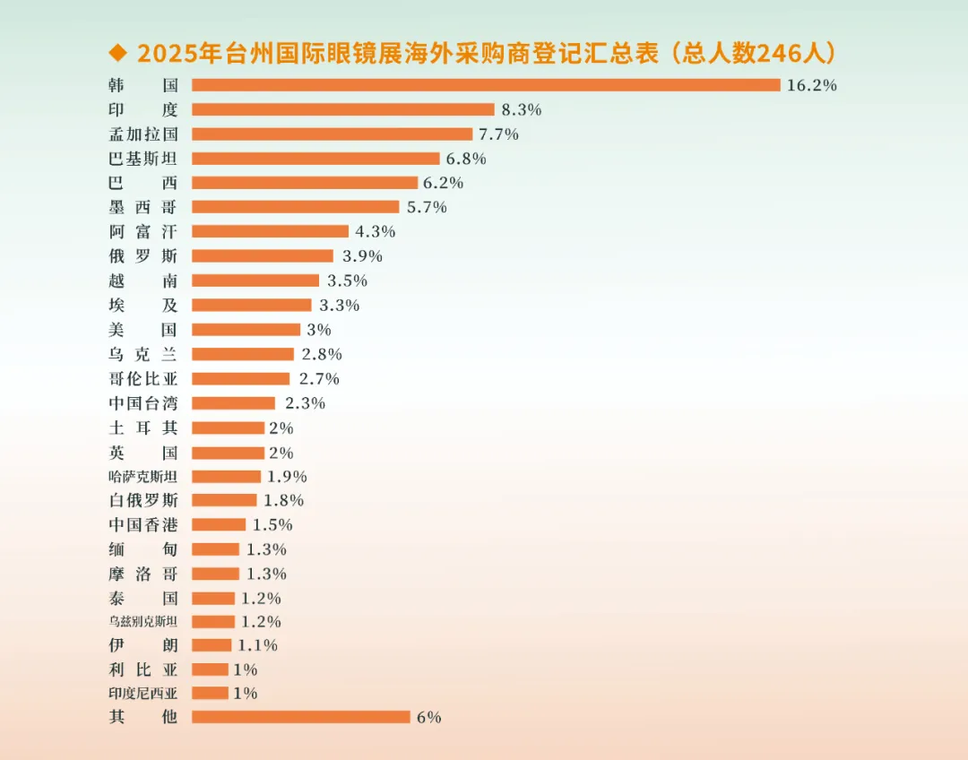 展会期间,入场总人次突破15,200人次,较去年同期显著增长6%,彰显展会行业影响力持续提升。从地域分布看,观众来源呈现高度专业化的特征:浙江(20%)、江苏(18%)、广东(15%)位列前三,且三地均为眼镜生产、销售的核心区,其观众占比超总人次的53%,充分印证展会精准吸引了产业链上下游的专业群体。此外,国际观众规模较上届实现较大增长,折射出展会国际化战略的成效。